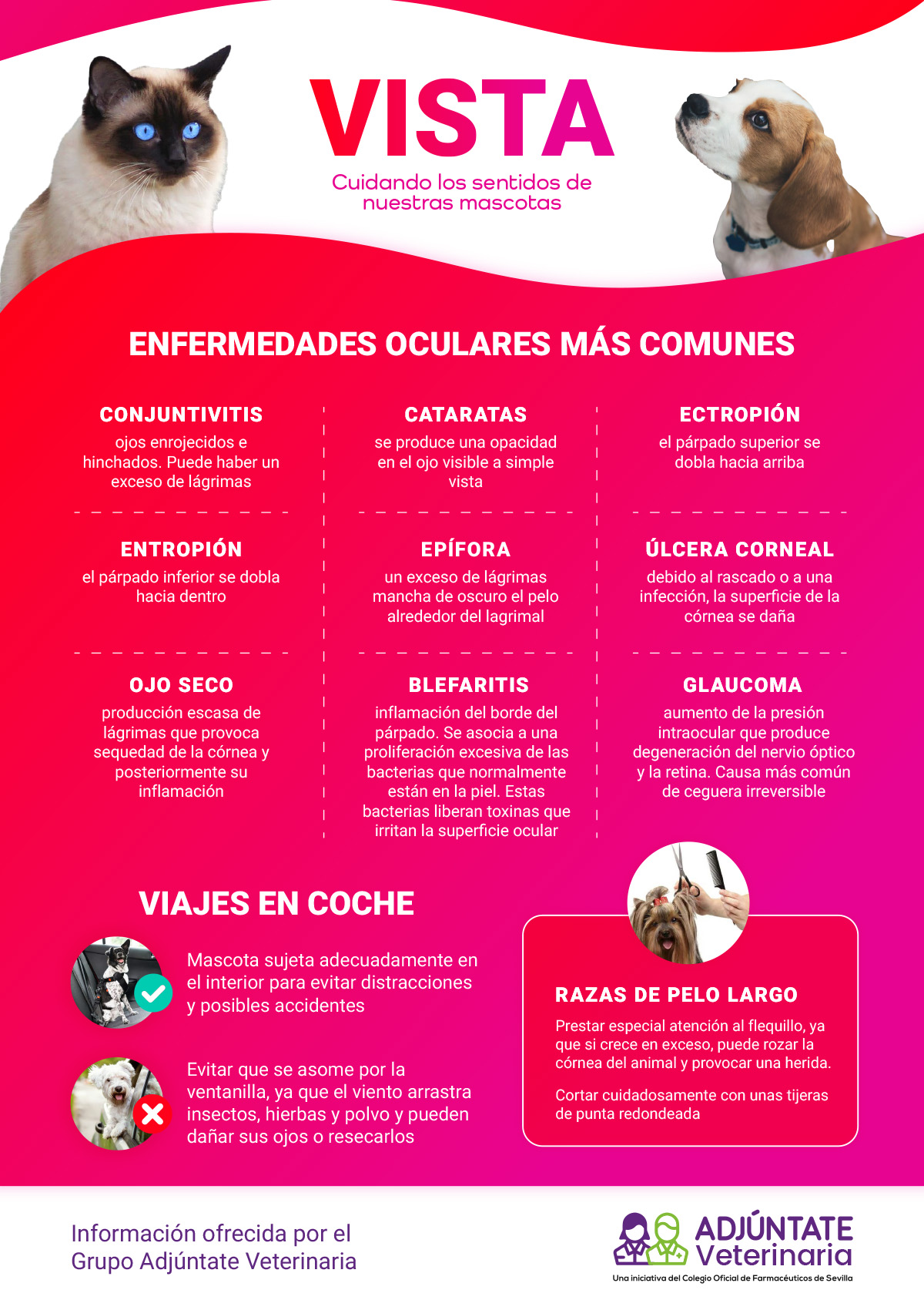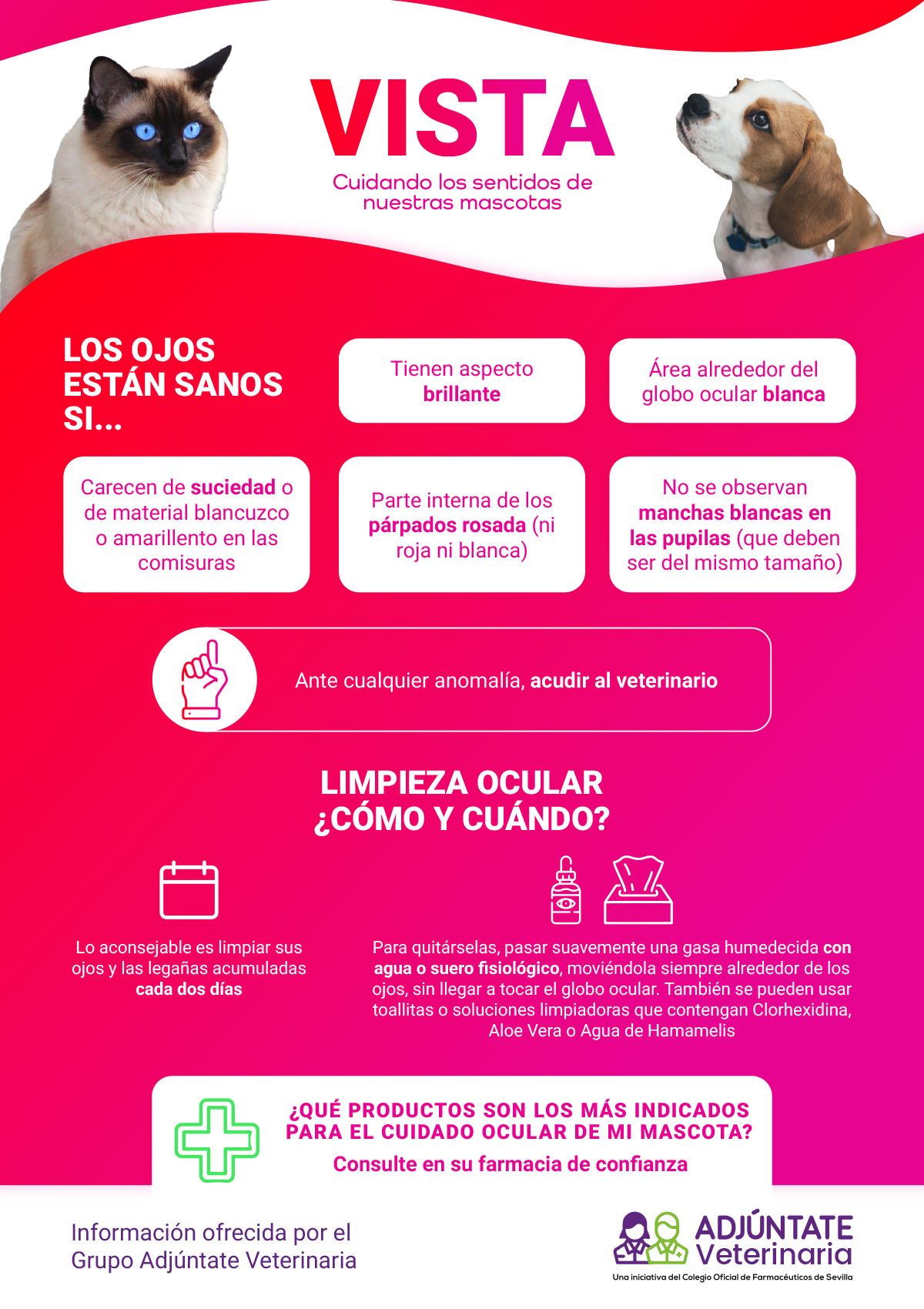 El Grupo #Adjúntate Veterinaria recoge en la siguiente infografía consejos para un correcto cuidado del sentido de la vista en perros y gatos: