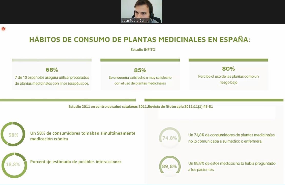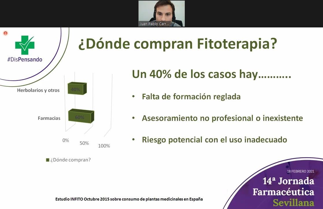 Le tomó el testigo Juan Pablo Carrera Estepa, farmacéutico del Grupo Adjúntate Fitoterapia. En su caso trató la dispensación profesional de plantas medicinales, una cuestión en la que la farmacia debe diferenciarse respecto a otros ámbitos de la mano de la indicación, seguimiento o farmacovigilancia que puede ofrecer un profesional cualificado para ello como es el farmacéutico. Esto es especialmente relevante ya que, como expuso Carrera Estepa, el 60% de los consumidores de plantas medicinales acuden a un canal de venta distinto a las farmacias, en donde no tienen en cuenta la medicación que toma el paciente y en otros directamente no hay nadie que le asista. Por lo tanto, se ratifica el necesario papel de los farmacéuticos y las farmacias como garantes del uso racional de la fitoterapia.