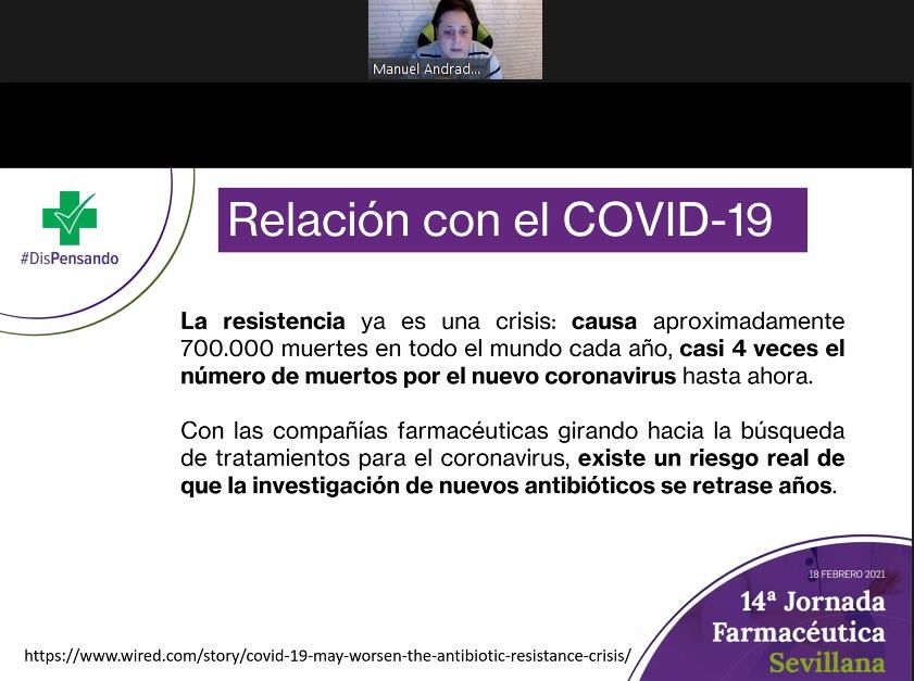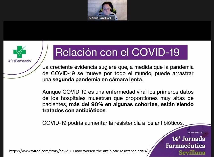 Cerró la jornada el farmacéutico Manuel Andrades con una ponencia sobre la correcta dispensación de antibióticos, reivindicando el papel que desde la farmacia se debe liderar en este ámbito a tenor del grave riesgo que supone para la salud pública las resistencias antimicrobianas generadas del consumo sin control sanitario de estos tratamientos, usados incluso para combatir de forma errónea resfriados comunes, gripe o COVID-19.